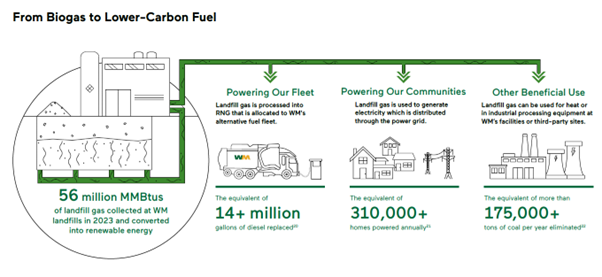 The first immediate benefit is the use of this converted biogas to power some of Waste Management’s fleet of collection trucks. The company’s own environmental footprint is reduced as RNG emits less greenhouse gases than using traditional diesel fuel. Almost half of its fleet now runs on RNG, making it the largest alternative fuel fleet in the waste industry.